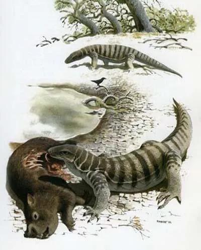 6、古巨蜥,澳洲史上最强猛兽。在澳洲大陆与南美洲分离前,古巨蜥就存在,随着地质运动,澳洲逐渐漂移。古巨蜥逐渐成长为长达八米的巨兽,成为澳洲历史上最具有统治力的猛兽,在孤立的澳洲大陆上,古巨蜥是独一无二的统治者,也就是大海阻碍了它的步伐,不然,它将成为远古猛兽中的有力竞争者。