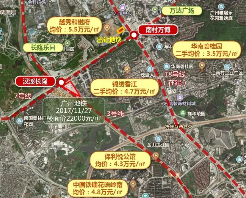 地块邻近万博站,位于地铁 7 号线南村万博站和汉溪长隆站之间。周边还规划有18号线,将连接天河、海珠、番禺和南沙,并有望延伸至中山和珠海,未来交通更加便利。
