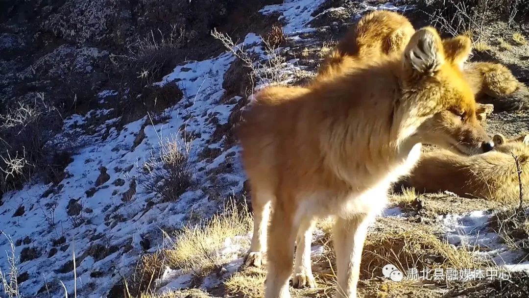 画面中,是位于祁连山国家公园盐池湾片区的高山裸岩地带,一群毛色棕红,黑褐色尾巴的动物,在高山上悠闲的散步、休息。同时红外相机也检测到大概有九只左右的豺群,竟然有一只母豺为首的严格等级制度,它们在红外相机前出现了一个小时左右才慢慢离开。