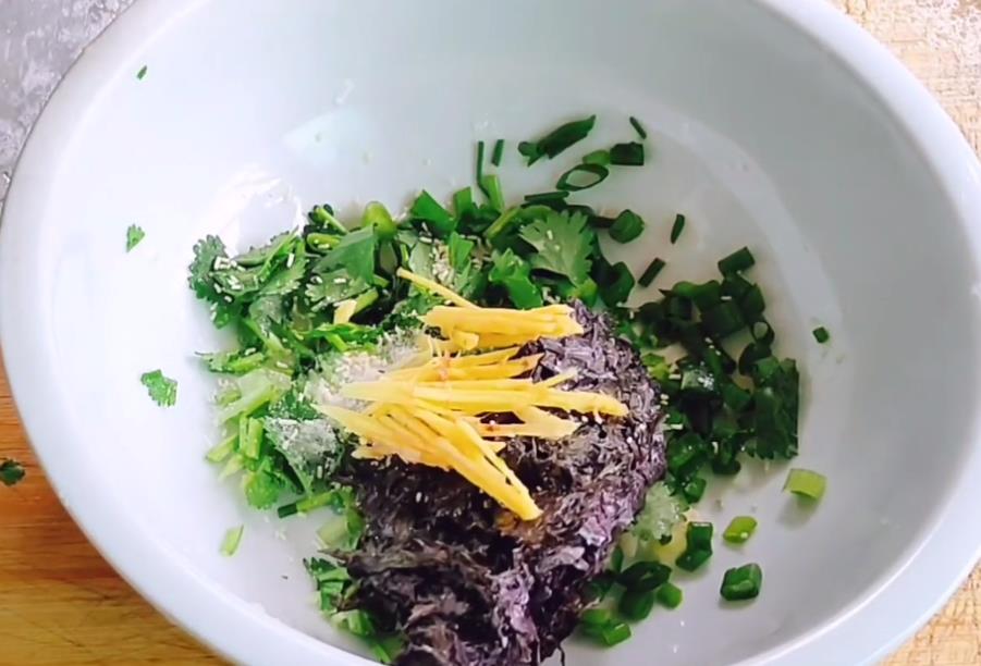 3、汤底的准备,碗中加入少许的食盐、撕一些紫菜、姜丝、1勺泡椒水、5个泡椒、5块萝卜酸,小半勺辣椒酱、再加入5滴香油增香,撒上葱花和香菜段;