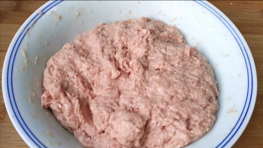 4、把肉馅平铺在盘里,将其抹平,大火将锅中的水烧开之后转中小火,用沾有少许水的勺子将肉馅挑起,一个一个往锅里放,几秒钟后肉稍微定型之后再改用大火,直到肉丸浮在水面上再煮一分钟就可以了;