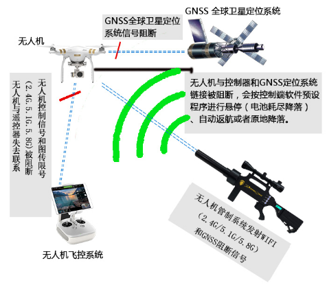 先科普一下无人机干扰枪设备,它是一种发射大功率电磁波的设备,通过电磁波对无人机遥控信号进行阻断,使无人机失去控制。一般普通无人机可以直接击落(失去GPS信号),对于智能无人机(拥有视觉定位等辅助定位系统)无人机,干扰枪也会对无人机的GPS和北斗信号进行干扰,会根据智能无人机的设定进行返航或原地降落。
