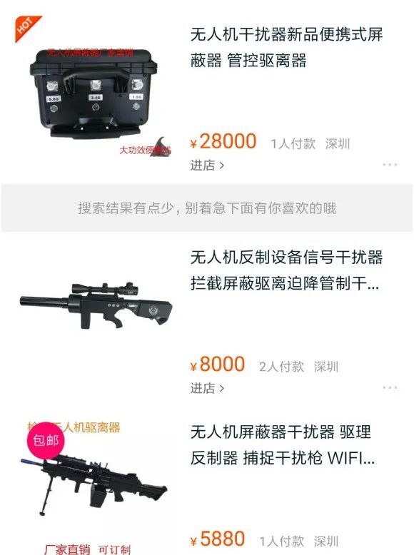 我们查找了国内外一系列的资料发现,无人机反制枪在大多数国家/地区都是严禁销售和使用的(有严格的生产和销售管理制度)。但我发现,在国内很容易就可以获得无人机干扰枪。随后我在国内的各个平台搜索“反无人机”关键字,立马能出来一堆无人机反制枪购买链接,甚至有看到少量成交记录。