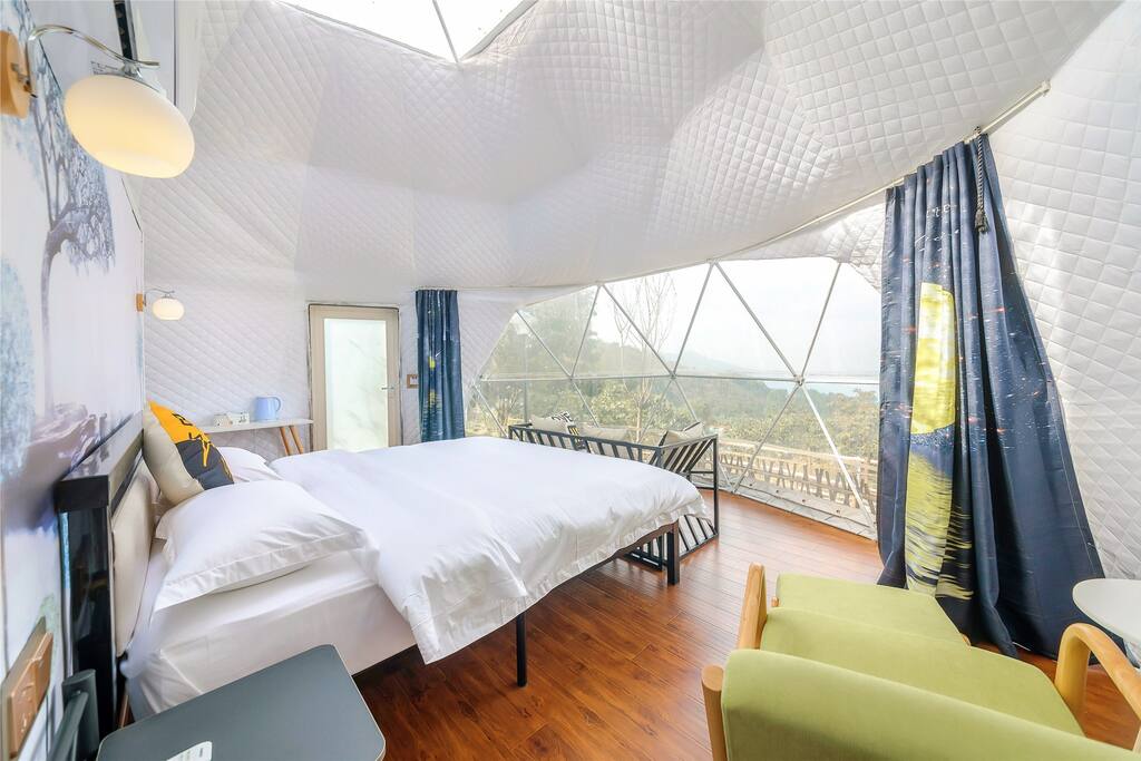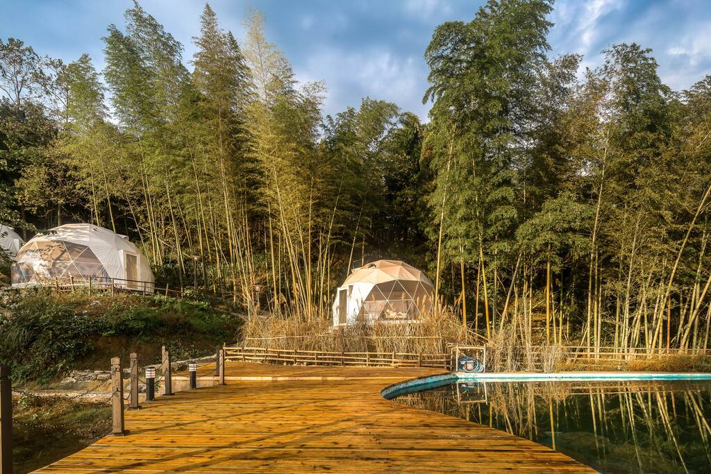 今天说的这家民宿有点偏野奢和度假,民宿属于营地风格,在营地里面有好多半球形的帐篷民宿,这些球型民宿不是纯透明的,但是住宿体验还是蛮不错的,帐篷民宿的后面是竹林,风景很赞,前面是湖泊,出门就是山景,不管是小情侣还是亲子游,这里都是不错的选择。