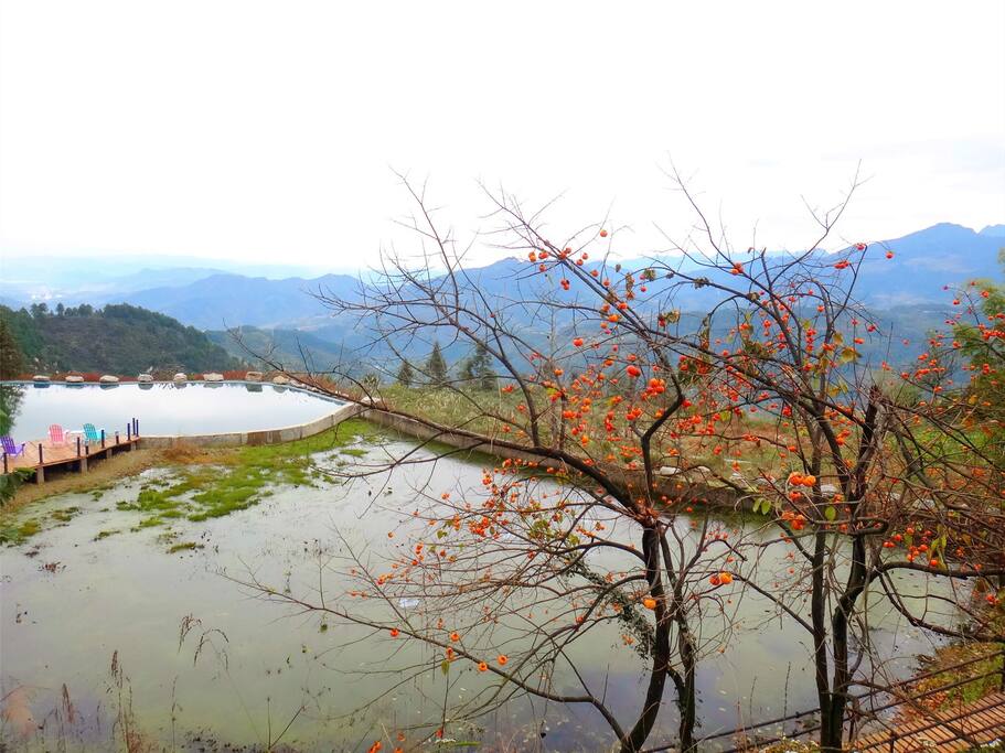 这家民宿其实是在山里,水资源并不丰富,为了能有好的住宿环境,设计者还是在这里打造了一个水池,水池旁边有椅子可以看风景,另外在旁边还有好多的柿子树,如果是秋季去,那么还能吃到自己现摘的红柿子。