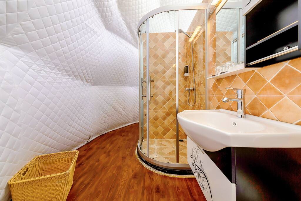帐篷民宿里面的空间不是很大,所以家具也不是很多,除了大床,后面还有一个洗漱区,洗漱区就在大床的后面,空间不是很大,但是可以洗澡和洗手,这种布局有点像我们之前介绍的蒙古帐篷的布局风格。