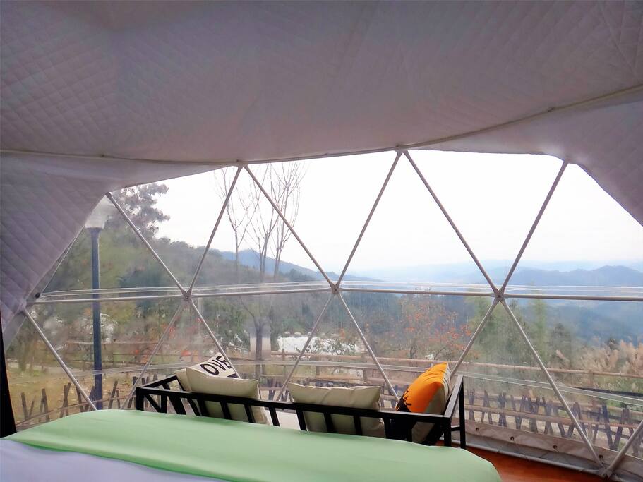 球型帐篷的内部有两个区域被做成了透明玻璃,一个是顶部的天窗,另一个是窗户,窗户还是蛮大的,兼了观景平台,观景区有沙发,坐在沙发上可以直接看到外面的风景,窗户上有窗帘,这个窗帘很有趣,拉上之后就是一幅星空的图,好漂亮。