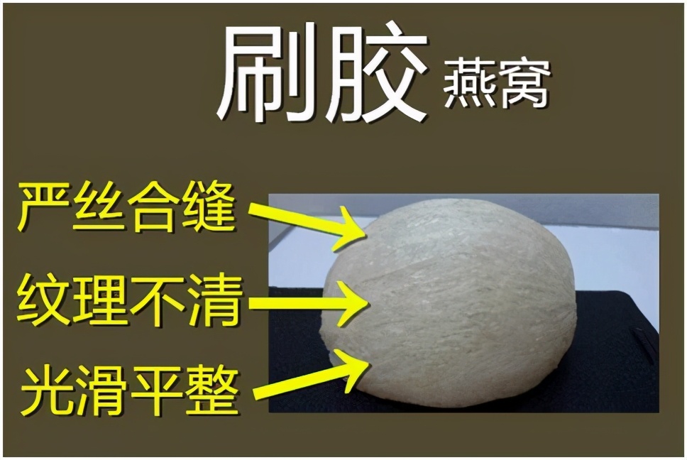 1.浸水检验:刷胶燕窝浸入水中取出,用食指摩擦数次,如感觉手指上有粘性,并且能闻到化学物质的气味,则属于刷胶燕窝。