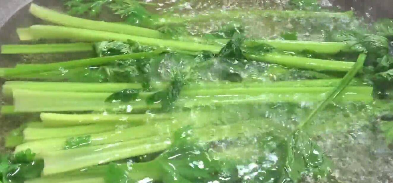 2、芹菜段焯水后,马上放入凉白开中过凉,这样的芹菜吃起来非常脆爽。