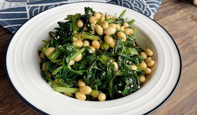 3、再次起锅,锅中倒入适量清水,开大火煮开后下入芹菜段,焯水30秒后芹菜变得深绿,随后捞出放入凉白开中过凉,过凉后的芹菜段捞出沥干水分,然后切成小段,全部切好后放入装有黄豆的大碗中备用;