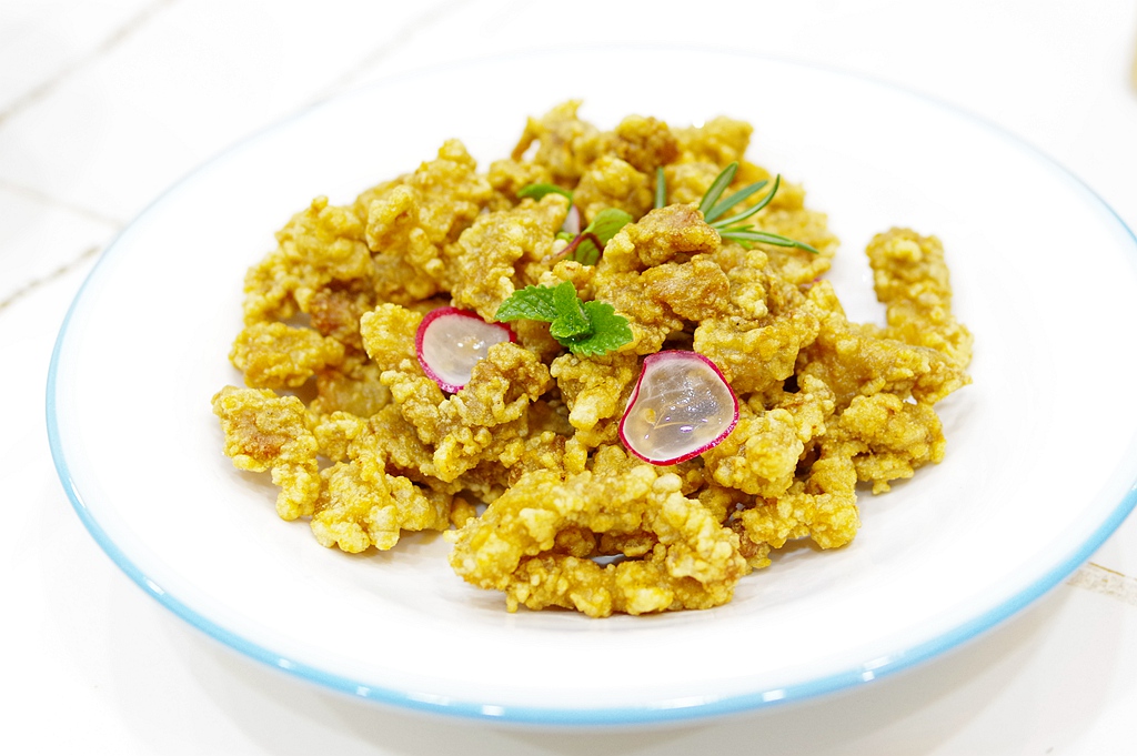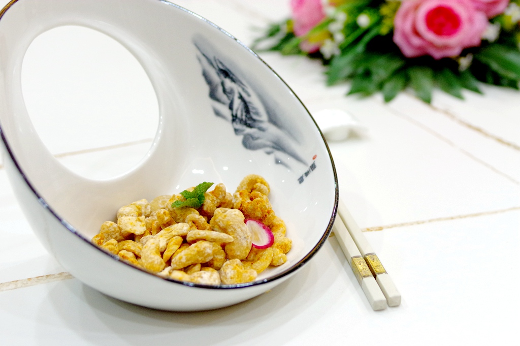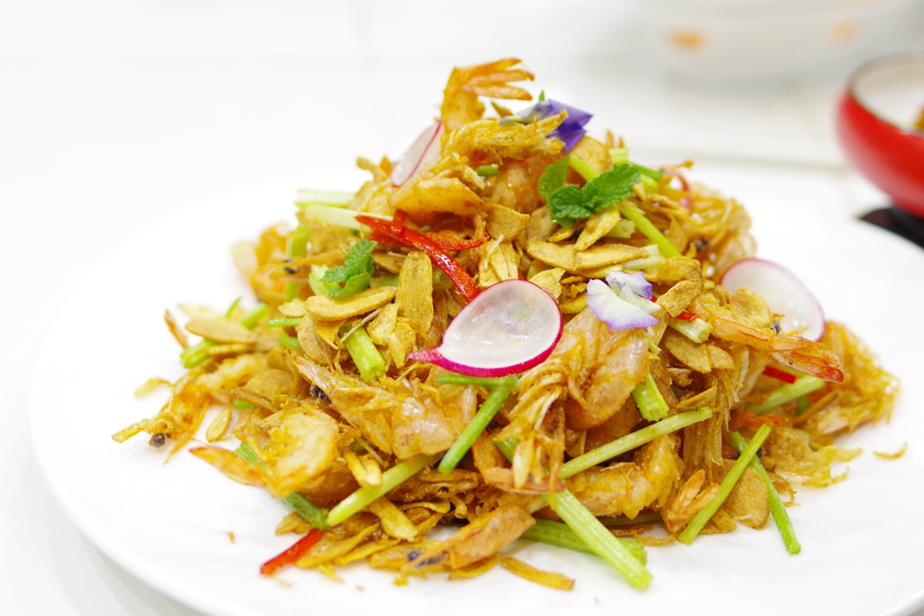 炸酥肉突出肉香,耐嚼;蒜香油爆虾突出蒜香,尖锐酥脆,两道都是纯粹的香口下酒菜。