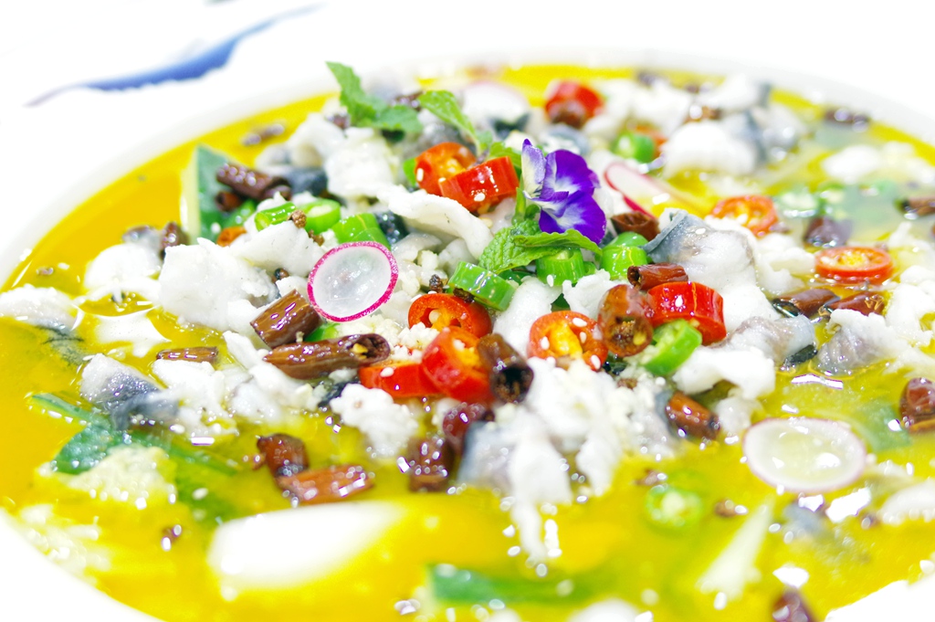 酸汤鳗鱼切成片,嫩滑是必然的,但关键是必须体现出鳗鱼肉的脆感。五彩酸辣的汤汁虽然相对而言比较重口,其实喝起来也蛮带劲。