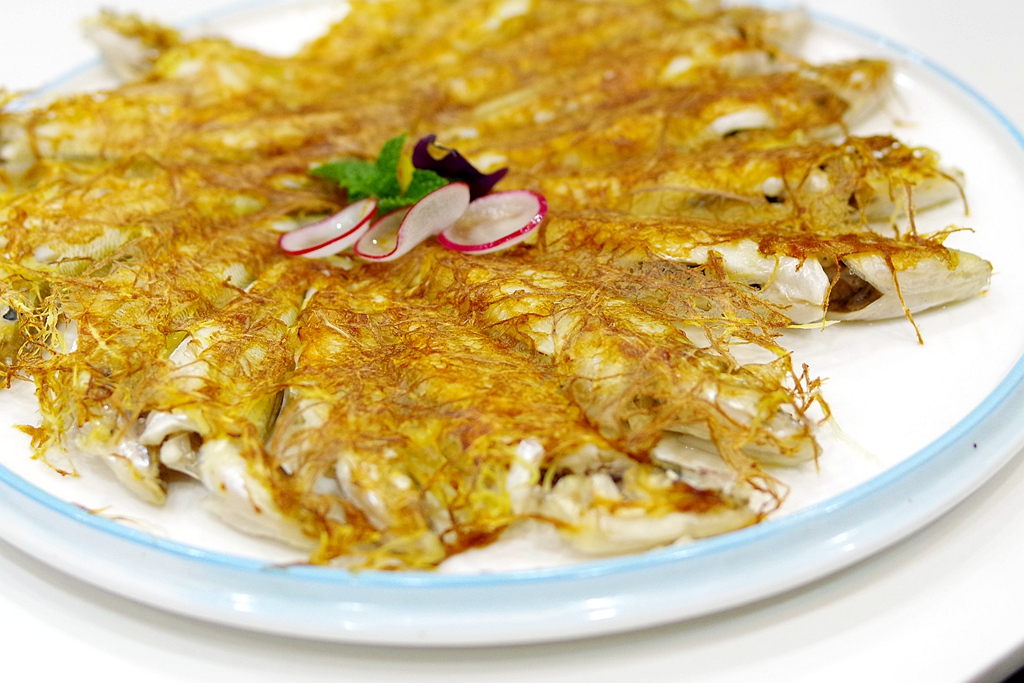 盐呛梭子鱼,这种做法则大量使用切得细碎的姜丝铺底,防止鱼肉巴锅,靠盐水和少许油把水分逼干后鱼自然就熟了,这种做法咸得入味,姜香十足。
