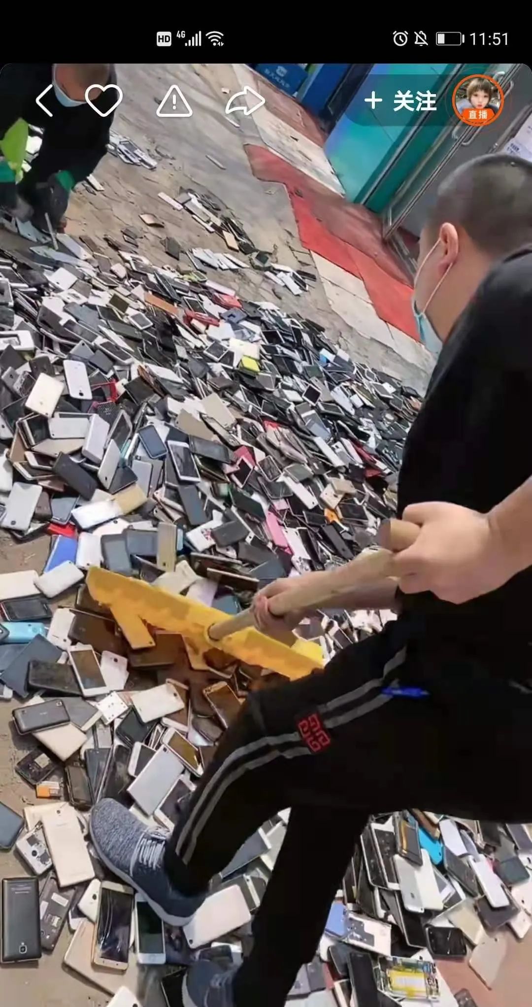在张二嫂的快手主页里,有一条播放上亿、涨粉数万的视频。视频中,张二嫂拿着铁锹铲全国网友们寄来置换的二手手机。