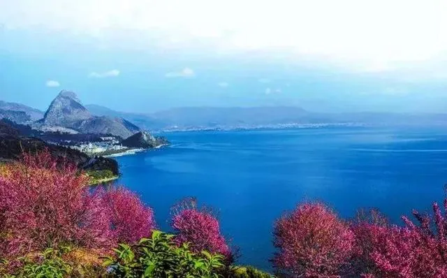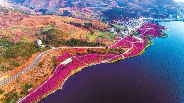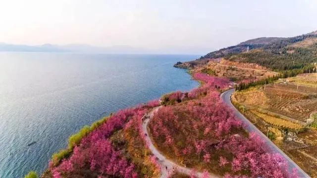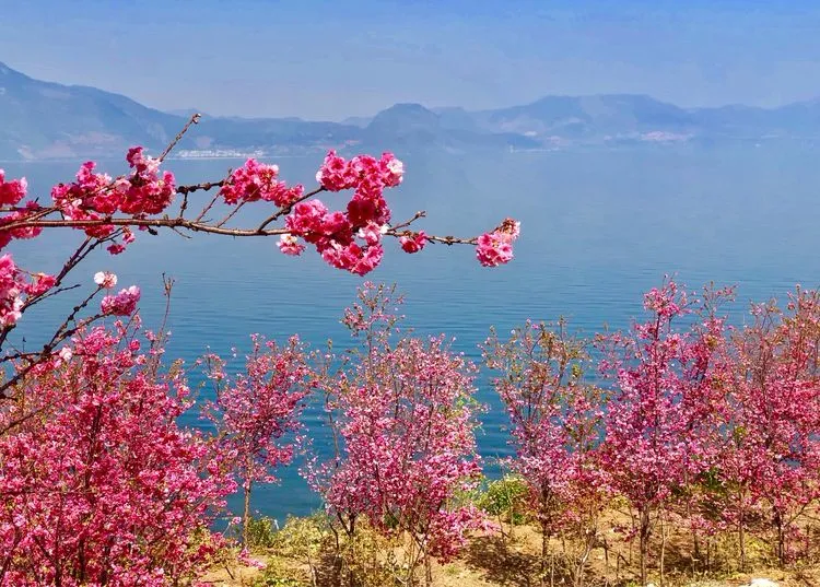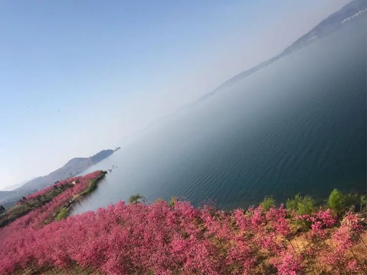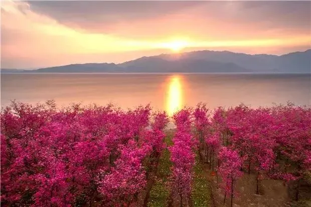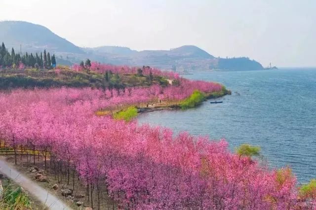 蔚蓝的抚仙湖和粉红色的樱花花海交相辉映,一片如云似霞,烂漫、壮观的花海。