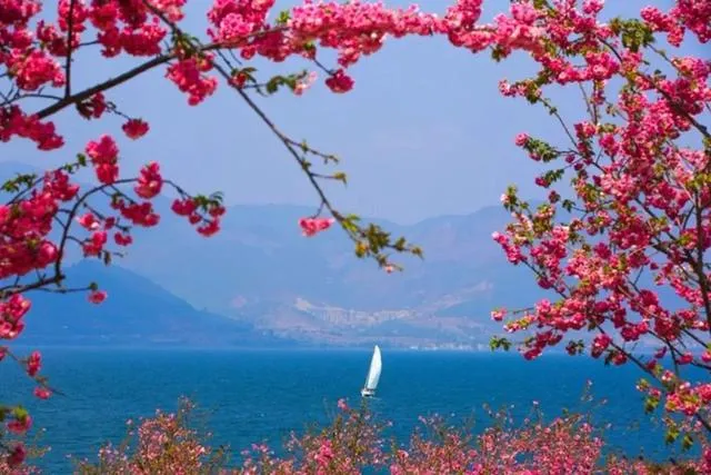 长达2.5公里的湖岸线被樱花覆盖,春风一吹,樱花便在空中翩翩起舞,把一旁清波荡漾的抚仙湖衬得更加美丽。走进樱花园,一不留神以为误入了油画世界。
