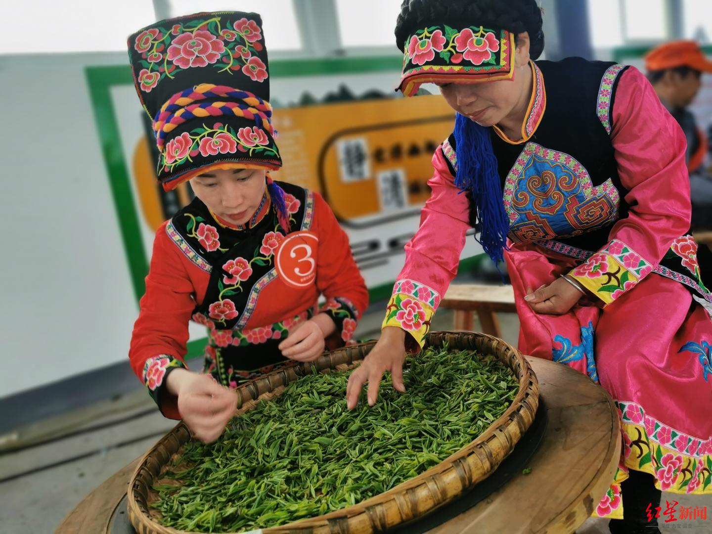 黄开会是北川曲山镇人,已经炒茶十余年。当天她身着羌族节日盛装,在现场比拼炒茶。她介绍,手工茶需要在高温铁锅中翻炒六次,再经过烘培,共二十余道工序才能出炉。