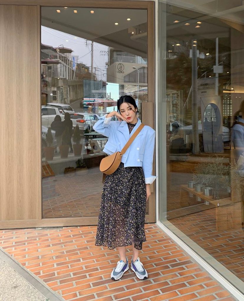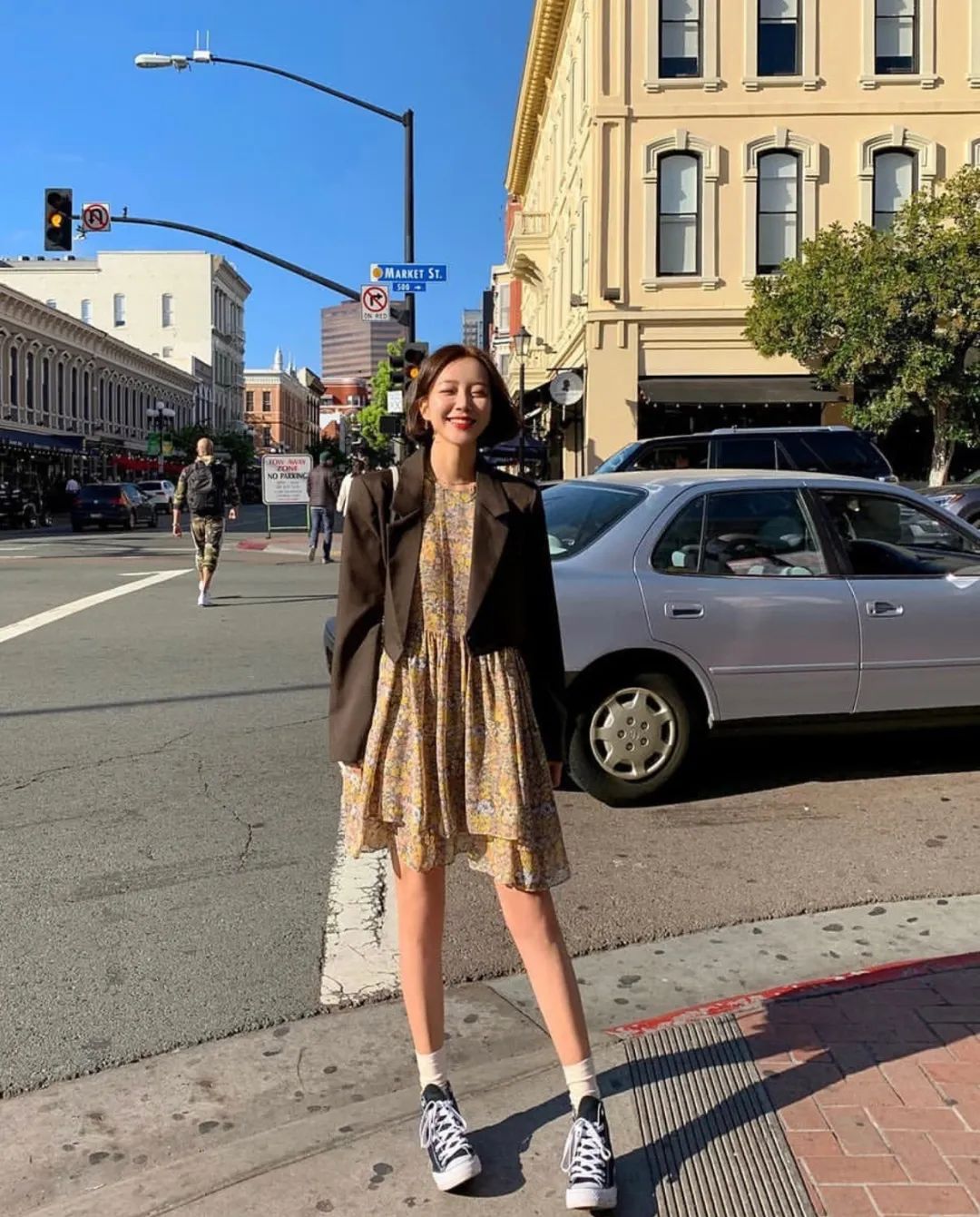 黄色的短印花裙清纯活力,特别是配上中筒袜和帆布鞋之后,搭配一件和裙子腰线一样长度的短西装,一繁一简相中和,时尚感up!