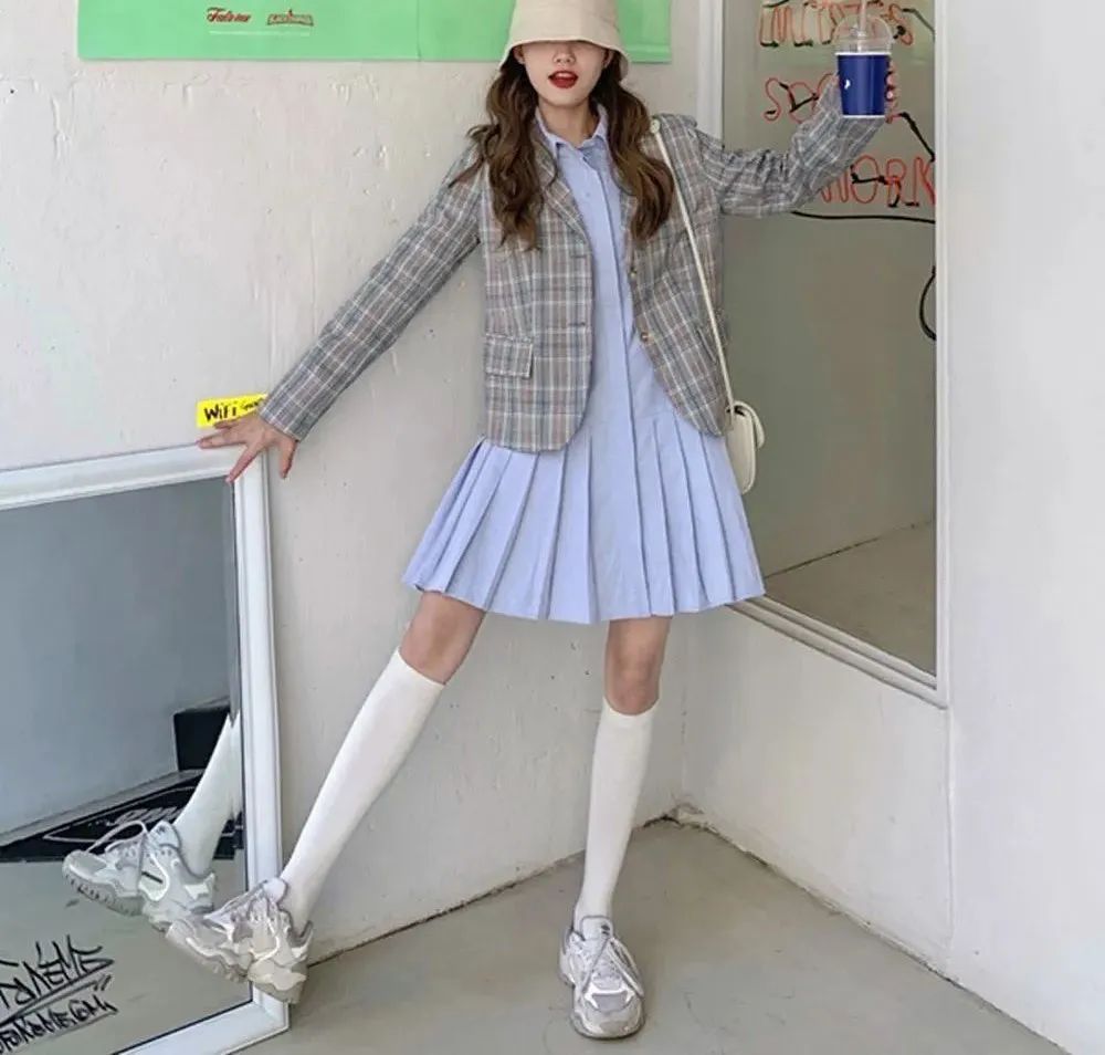 仙女们不要再觉得短西装不适合学生党惹,穿搭模板在这里,格纹西装外套搭配衬衫连衣裙,百褶的裙摆充满青春活力,学院风十足的look,快穿上和男神去约会吧!