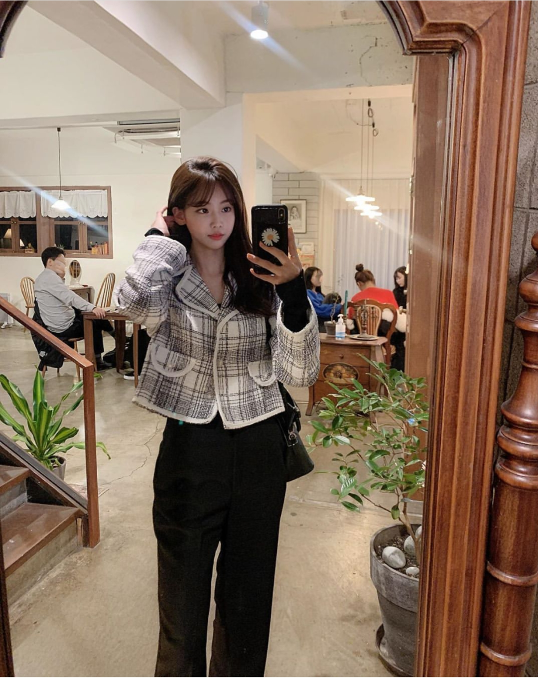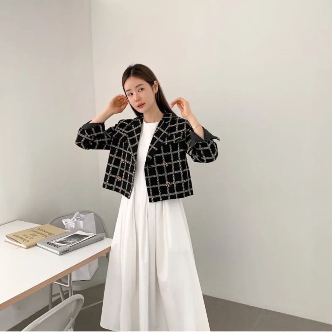 短款的格纹呢料西装外套会有一种小香风的感觉,自带贵气,搭配奶白色的拖地裤,给人一种非常舒适的视觉感受。