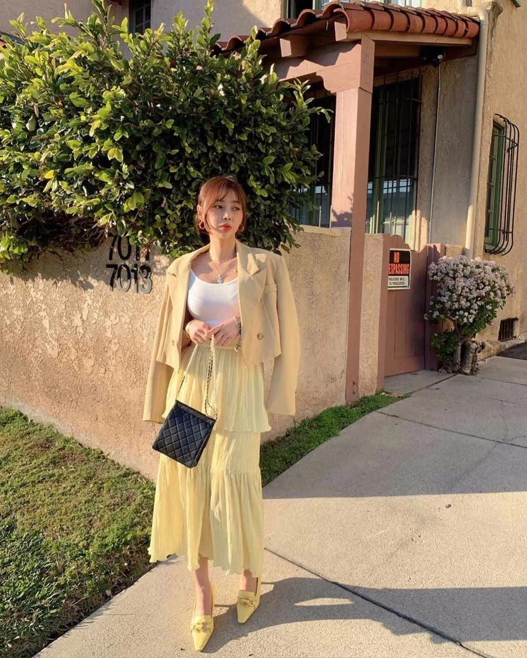 除了套装以外,上下同色系穿搭也是一个很不错的选择,柠檬黄很衬肤色,十分显白,再加上浪漫飘逸的雪纺蛋糕裙,轻松美出名媛淑女风。