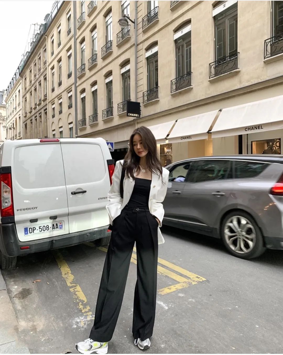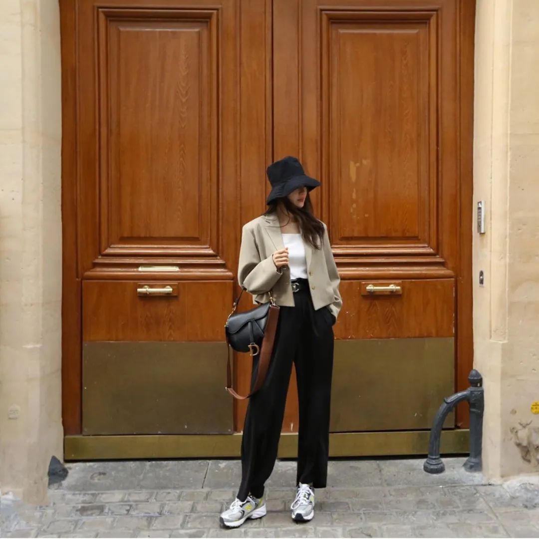黑白配是永远不会出错的色彩搭配,害怕会过于正式的话,那么就在鞋子上下功夫,选择一双老爹鞋,街拍感扑面而来。