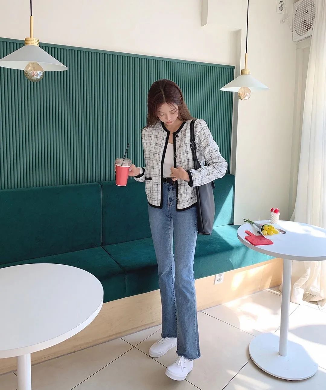 圆领包边的小香风西装外套适合走轻熟风的小可爱们,搭配牛仔微喇裤,非常优雅,完全就是白富美小姐姐了。