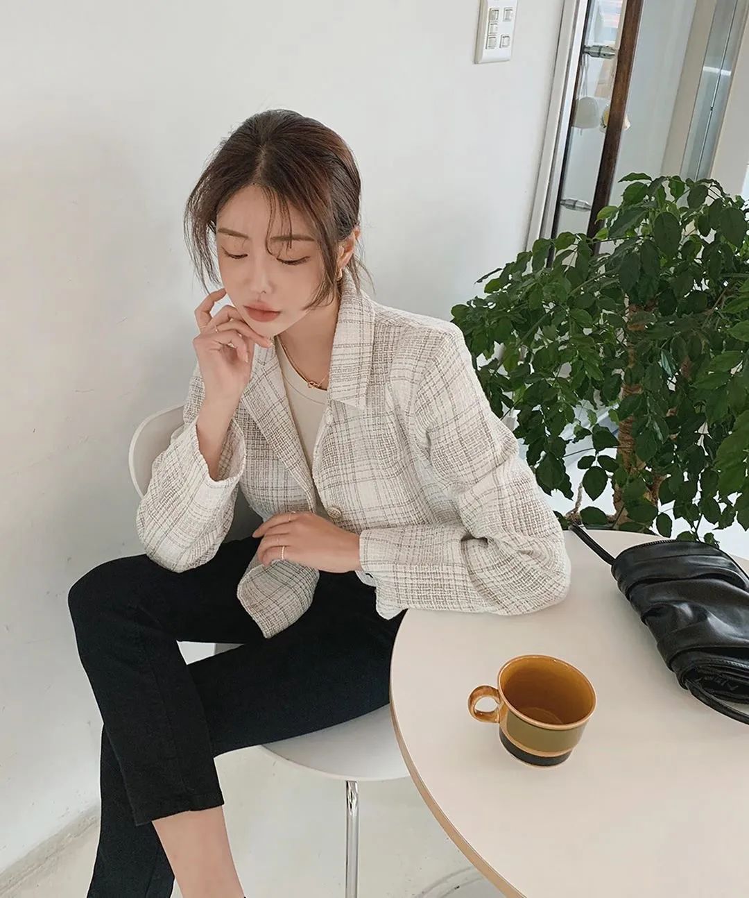 白色的小香风格纹西装给人一种十分清爽的感觉,简单搭配同色系内搭和黑色九分裤,就能展现出你的高雅气韵。