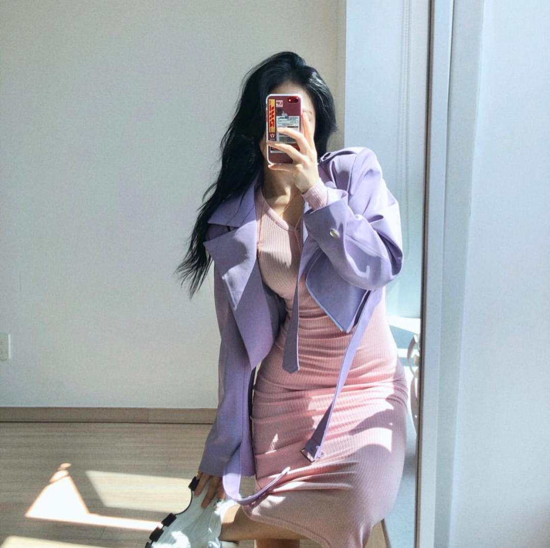 针织的连衣裙比较适合现在这种温度变化比较大的天气,再套上一件短西装外套,给人意外的惊喜。