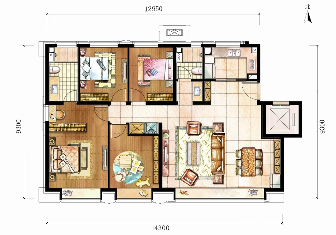 洋房顶配是约140平的四居双卫,四居里的终极格局,大面宽短进深设计,南向总面宽达到了约14.3米,得益于低密洋房的禀赋,这个面宽尺度非常少见。