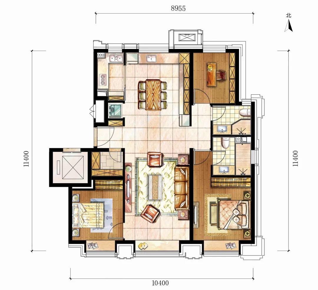 首先是约118平的三居双卫,南北通透,南向三面宽格局,南向总面宽达到了约10.4米,客厅+双卧朝南,带3个南向大飘窗,餐厅+厨房+次卧朝北,南北通透三面朝南,主卧套间设计,带独立主卫。