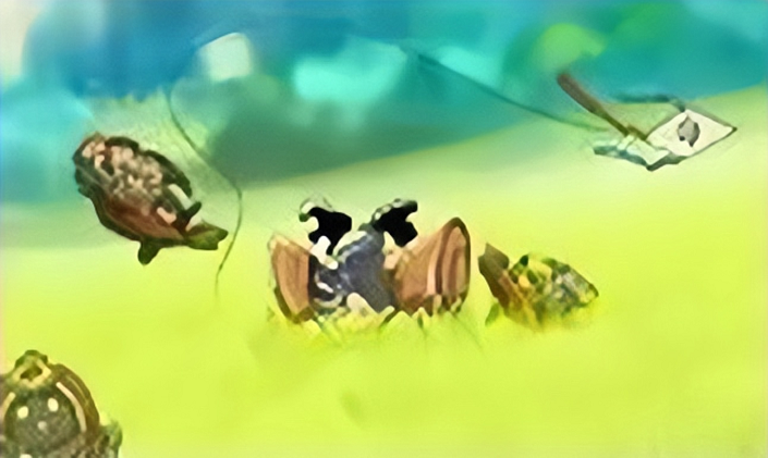 可能有些玩家看不懂这张图到底是什么结构,小于简单讲一下:这是一个摔成“狗吃屎”状态的蒙犽,两个黑色的是他的脚,头在前面,头两边是肩膀上的“大鼓”,再往旁边的是两个武器“龙舟”。