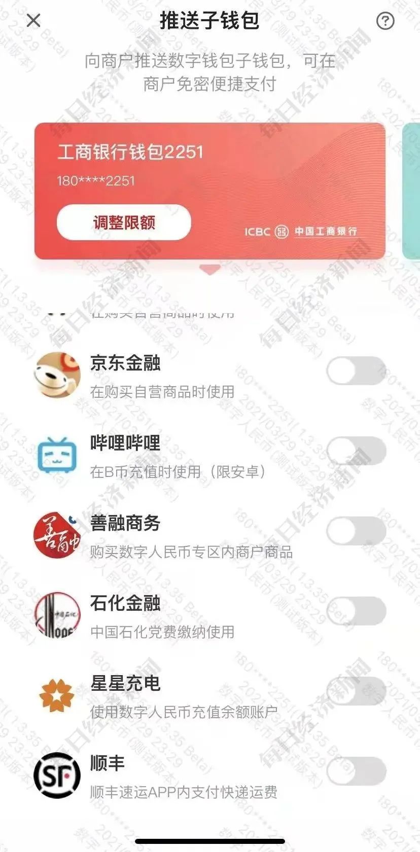 除了各类线下的大型商场百货、购物中心、连锁商超餐饮店、旅游景点购票、加油站等缴费充值渠道等,还有京东、美团、B站、滴滴、顺丰等互联网头部平台,数字人民币的消费场景已从线下商户扩展到线上。