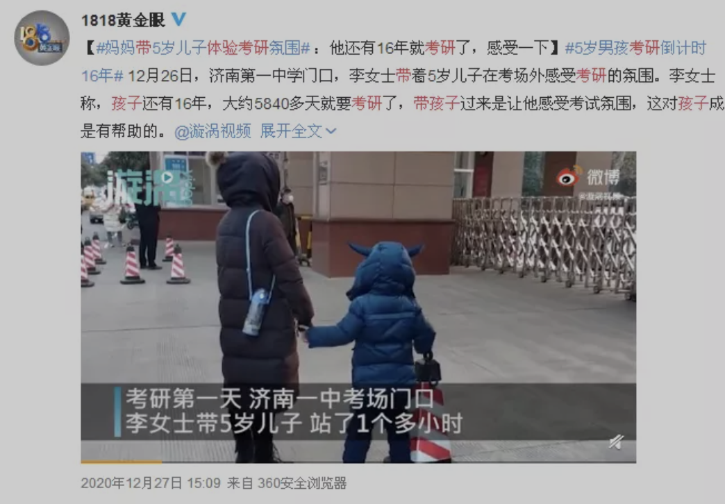 一位妈妈,带着5岁的孩子在寒风中站了一个多小时,美其名曰是让孩子过来感受一下考验的氛围。