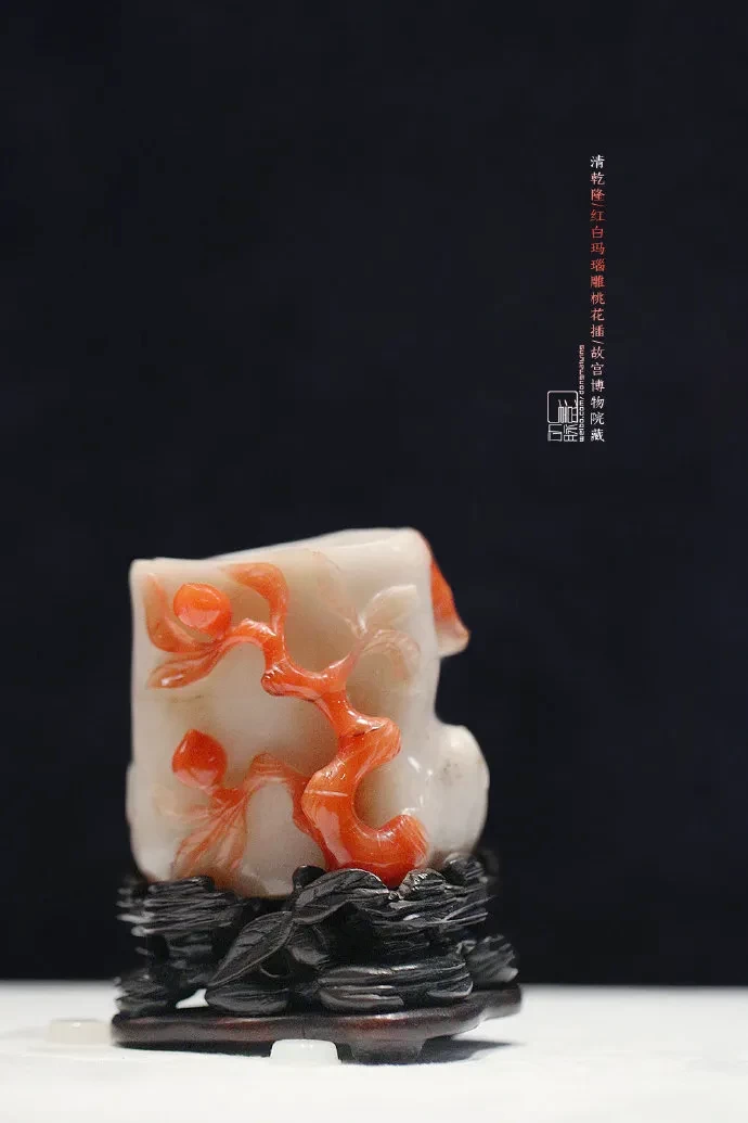 这个插花瓶,是在玛瑙上雕刻出栩栩如生的桃枝桃叶,灵动小巧。
