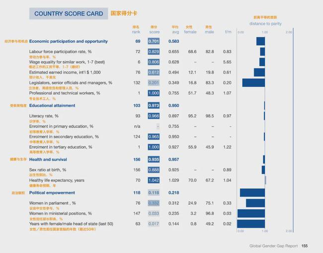 但真正能关照现实情况的,其实并不是国与国之间的排名比较,而是各国男女两性在经济、政治、教育、健康方面的差距。
