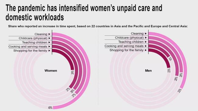 联合国妇女署《从洞见到行动:2019冠状病毒病背景下的性别平等》中揭露,疫情期间,女性在清洁、育儿、烹饪、购物等每一项家务劳动指标中的承担比例都比男性高。