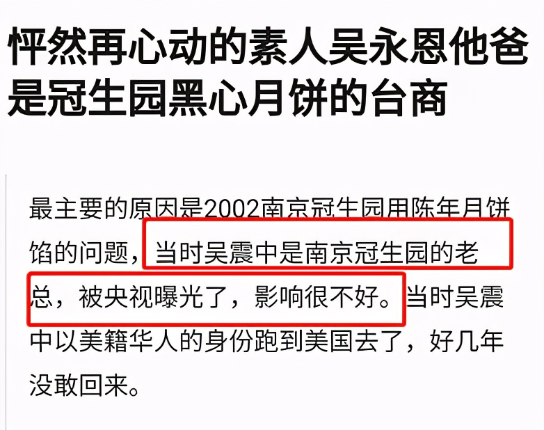 就在很多网友都觉得吴永恩的爸爸是一个慈善家的时候,“天雷滚滚”的事情来了,吴震中这些年致力于慈善没有错,但是他也是当时南京冠生园的老总。