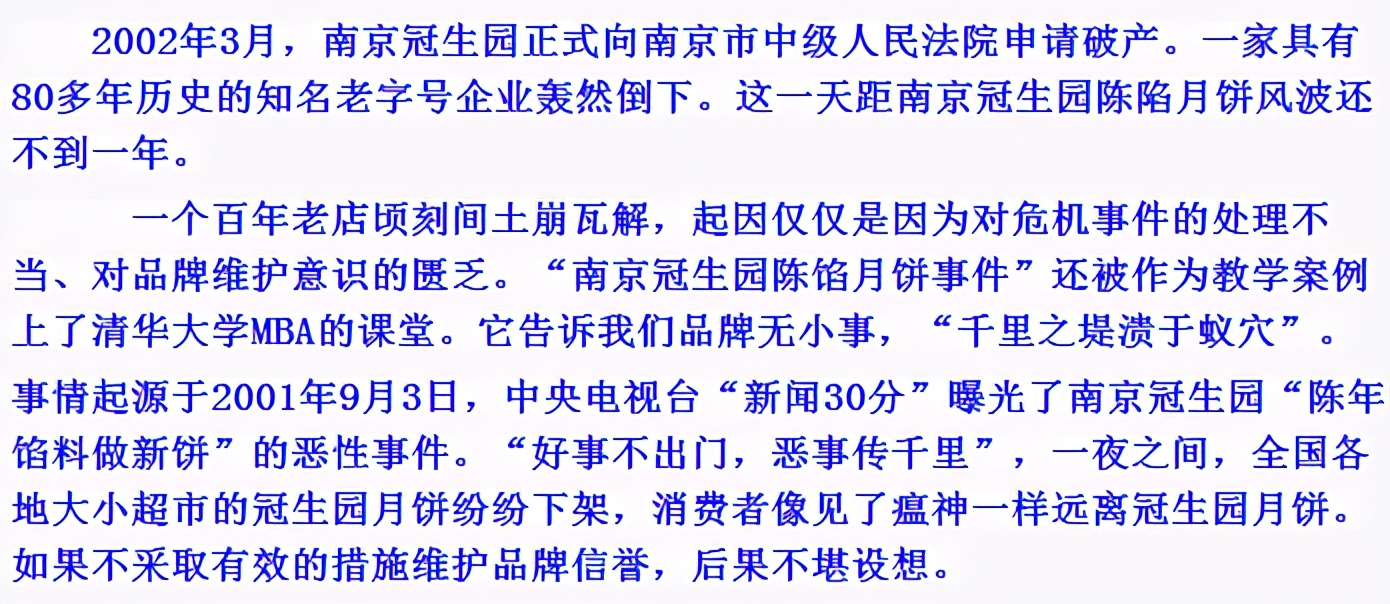 南京冠生园是一家老字号的糕点品牌,在2001年的时候,南京冠生园因为用陈年月饼馅的问题,被央视曝光,在当时影响很大,2002年南京冠生园就申请了破产。