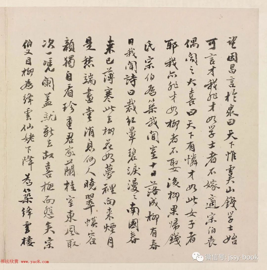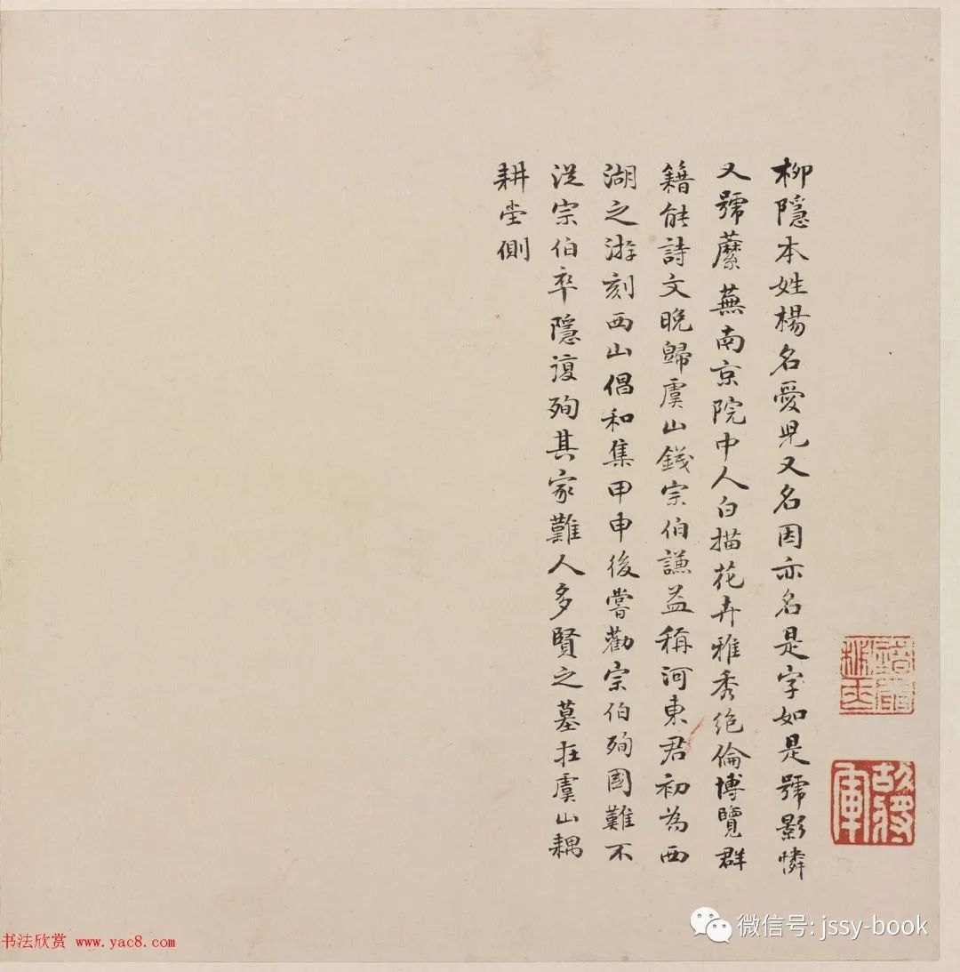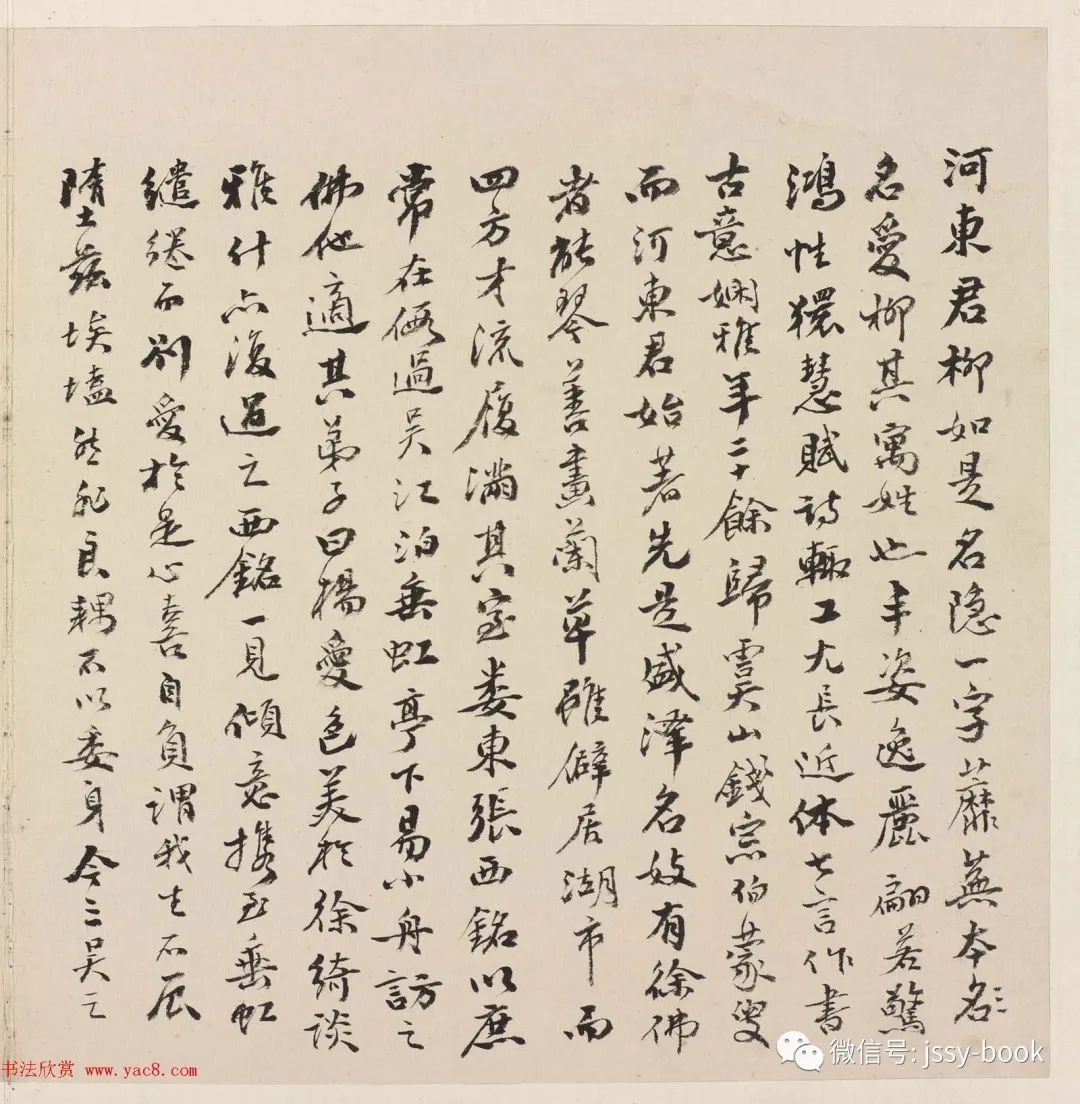 秦淮八艳柳如是字画《河东君仿古真迹》册页,美国弗利尔美术馆藏。女诗人柳如是,本名杨爱,字如是,又称河东君,因读宋朝辛弃疾《贺新郎》中:“我见青山多妩媚,料青山见我应如是”,故自号如是。与马湘兰、卞玉京、李香君、董小宛、顾横波、寇白门、陈圆圆同称“秦淮八艳”。后嫁有“学贯天人”“当代文章伯”之称的明朝大才子钱谦益为侧室。柳如是是明清易代之际的著名歌妓才女,幼即聪慧好学,但由于家贫,从小就被掠卖到吴江为婢,妙龄时坠入章台,改名为柳隐,在乱世风尘中往来于江浙金陵之间。留下的作品主要有《湖上草》、《戊寅草》与《尺牍》。此外,柳如是有着深厚的家国情怀和政治抱负,徐天啸曾评价“其志操之高洁,其举动之慷慨,其言辞之委婉而激烈,非真爱国者不能。”