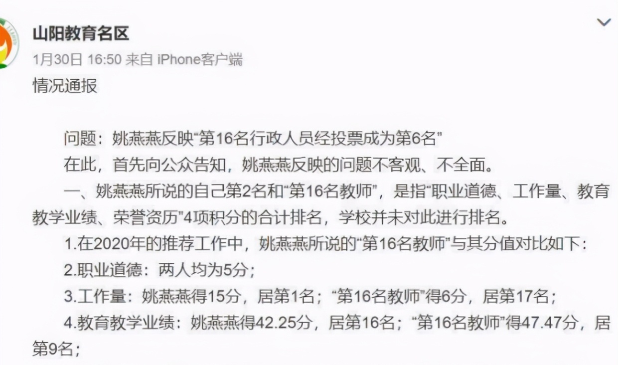 3、前五项的实际工作量、表现、成绩能够排在第二名(虽然学校说没有这样排名。但实际应该也是这样的吧,姚燕燕应该没有在这里说谎),那为什么民主测评这一项就能把她一下子划拉下来到最后一名。你既然公布了第十六名教师民主测评、处室负责人、考核小组的投票情况,怎么不也一起公布一下姚燕燕的投票情况,通过具体对比来说明情况不是更好,更有说服力吗?