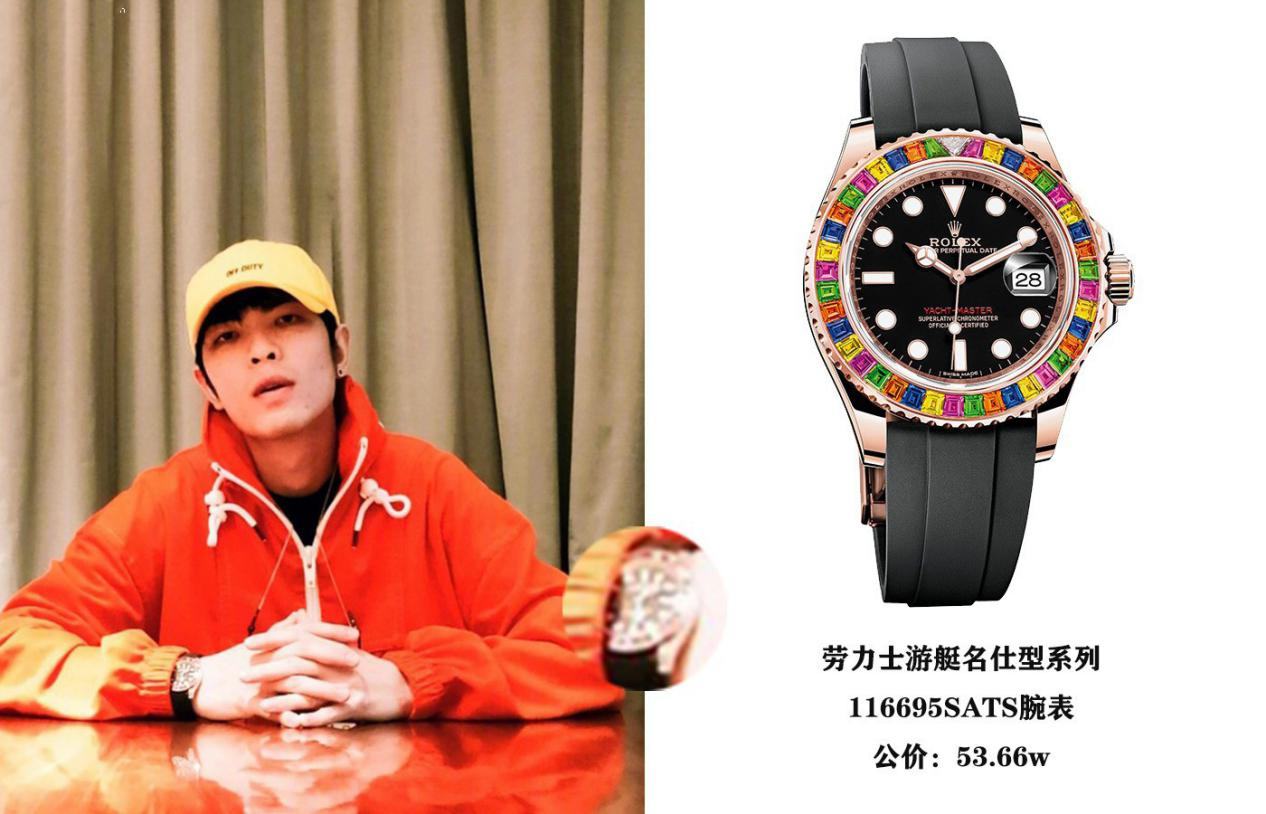 这款欧劳力士是萧敬腾的爱表之一,经常出镜在他的各个照片之中。这款迪通拿表径40毫米,对于他来说尺寸适中,十分贴合他的手腕。采用18k黄金打造表壳,固定外圈连计速刻度。搭配黑色表盘和棒状指针,三个金色的蜗形小秒针盘分别位于3、6、9点钟方向。腕表搭载瑞士天文台认证的劳力士Cal.4130自动机械机芯,防水深度100米。