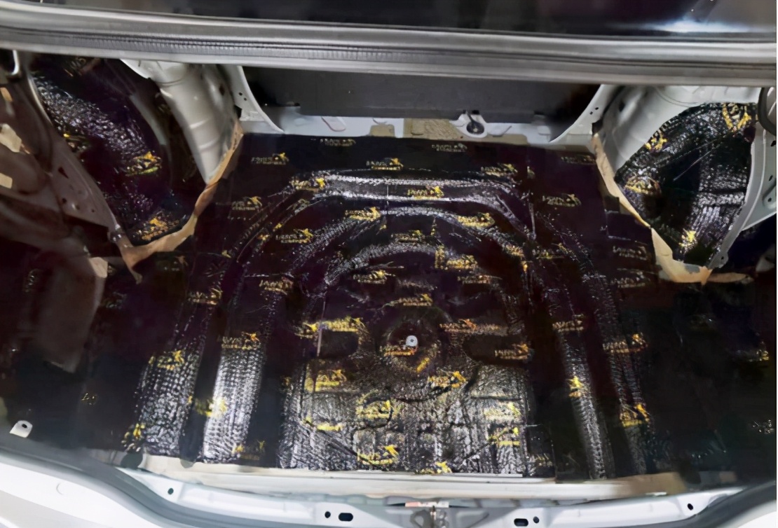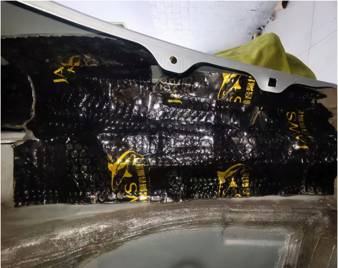 原车的后备箱是一个空腔结构,汽车行驶后备箱很容易产生低频共鸣,所以技师使用黑金减震胶,对后备箱做了止振处理,从根本上降低了共振噪声的产生。