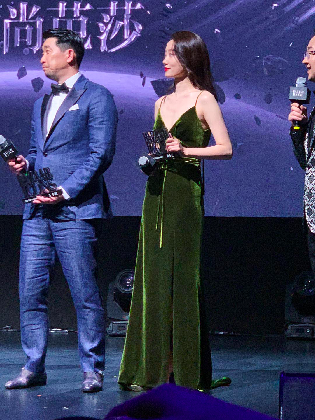 不过我觉得还是内场的那身绿丝绒长裙更适合她,设计简约又修饰身形,也是来自国内设计师,真的又美又有气质。