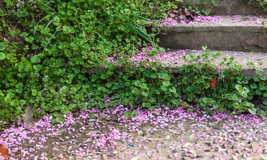 还有些落在台阶上,人走过,仿佛脚底都带着花朵的清香。