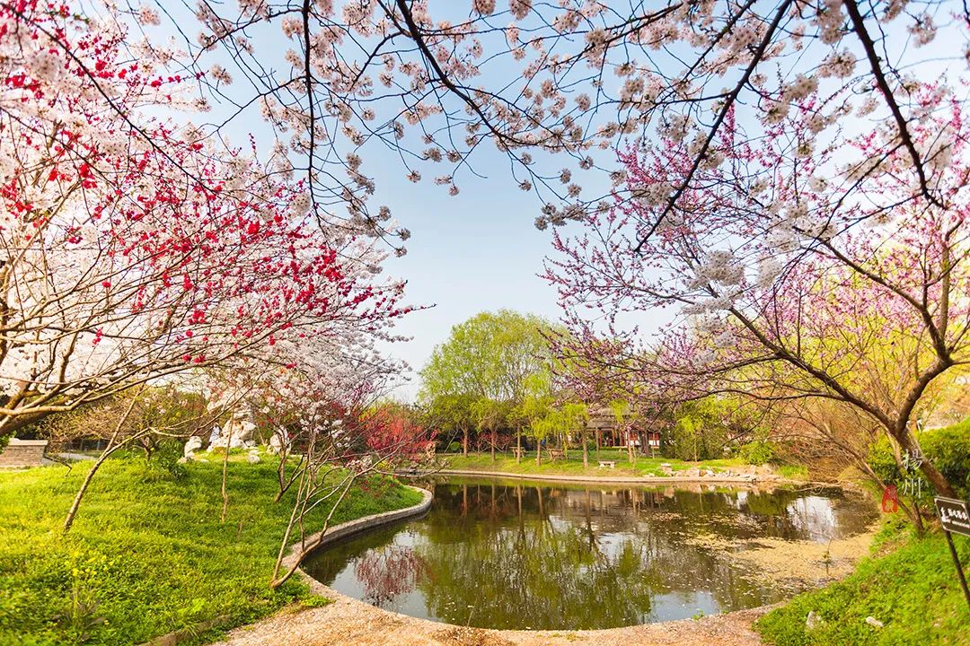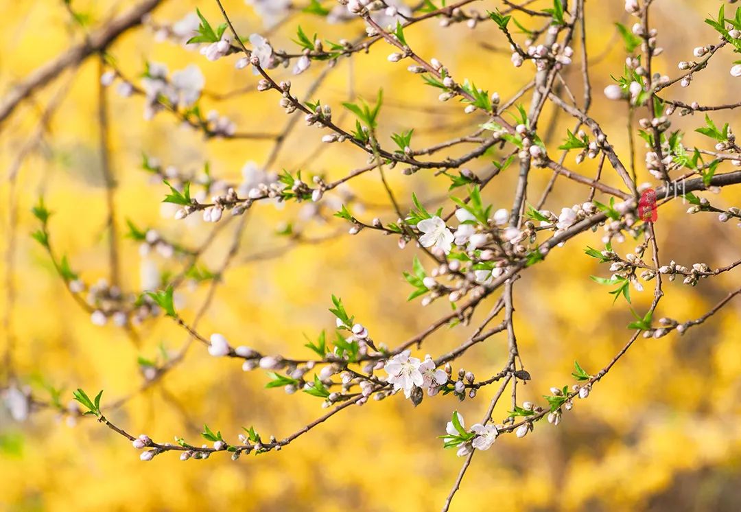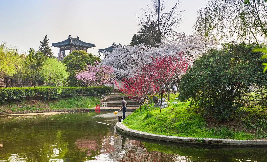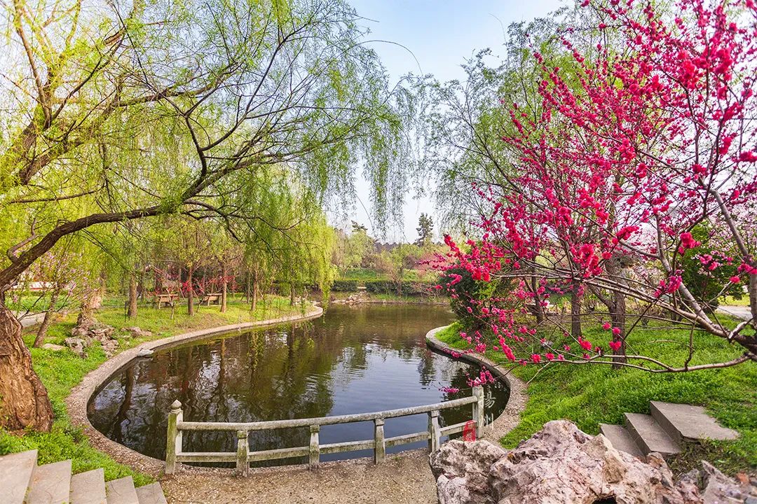 遗址内部,也是浓浓的春意扑面而来。池塘边,柳树刚抽新芽,在微风中轻轻摇曳,丝丝缕缕的绿色渲染得刚刚好。另一边则是红到耀眼的桃花,此时桃花还未长出叶子,只有一朵一朵开得热烈的花朵。
