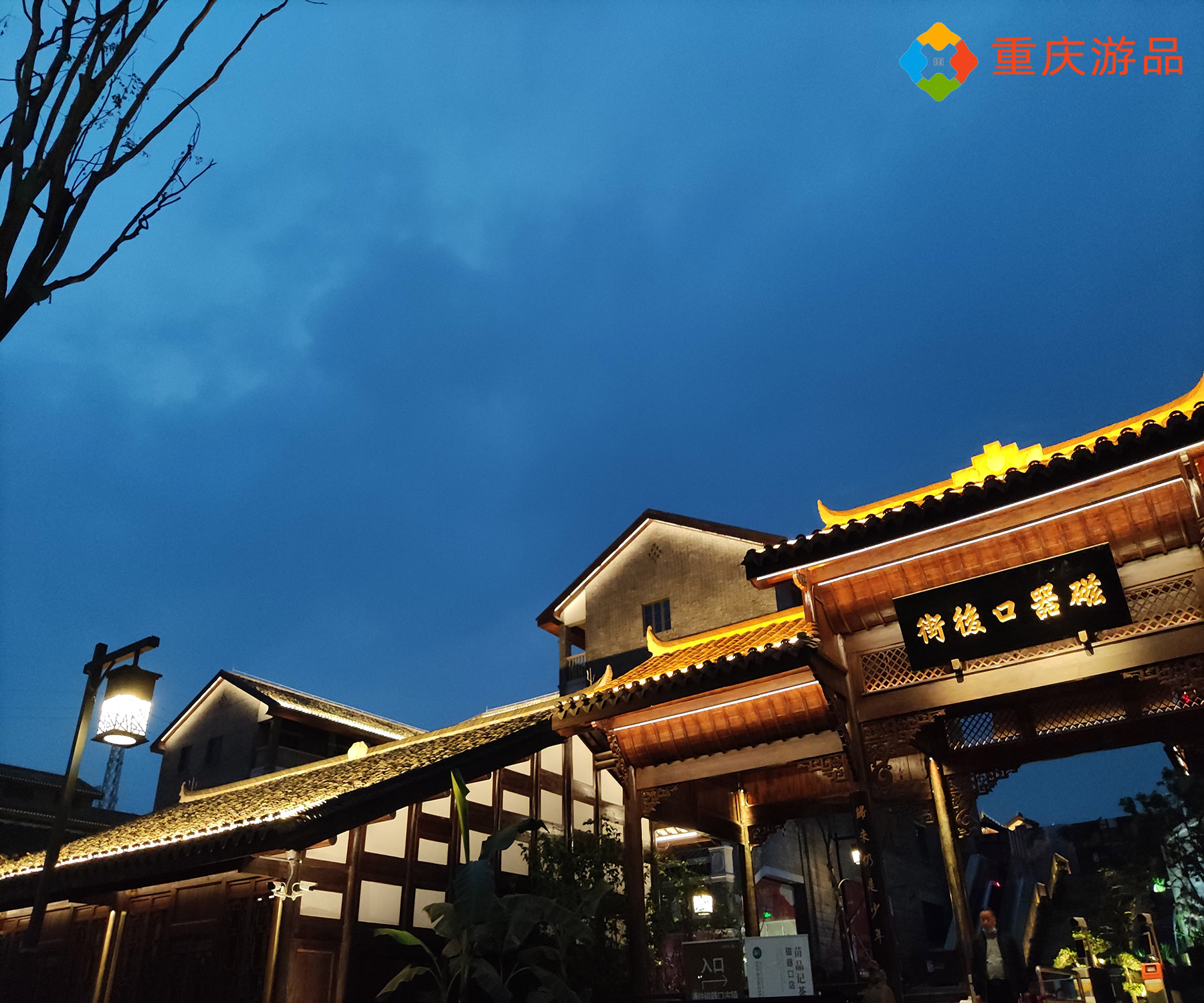 傍晚的磁器口,在灯光的修饰下,建筑的线条更加柔美,色调更加温暖。像西门不远处的一座石门,好大的石门在夜幕中被灯光照得金碧辉煌,大气磅礴的感觉油然而生。