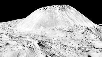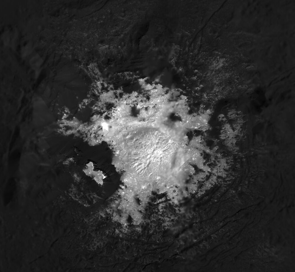 一项令人意外的发现证实了这一点,一种稀有矿物——冰盐的存在。通过光谱分析发现,这种水合形式的氯化钠位于赛睿利亚光斑穹顶的最顶端,也就是欧卡托撞击坑中最亮的点。