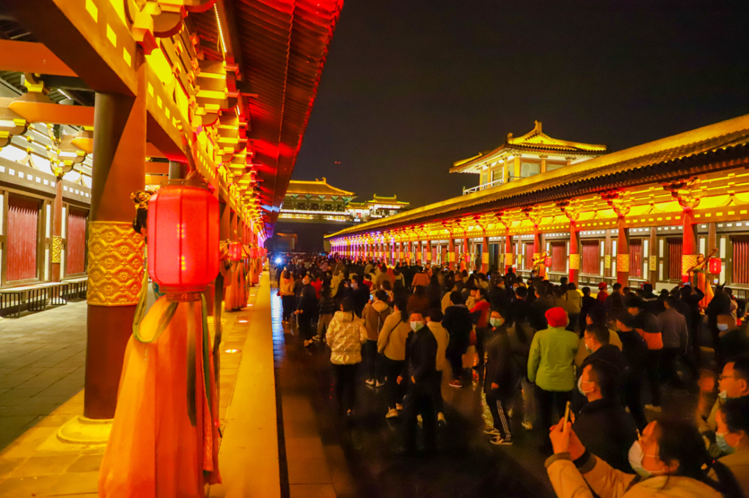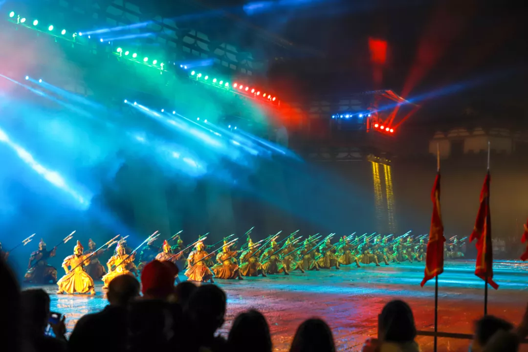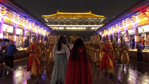 浩浩荡荡的金甲御林军,一支支优美的盛世舞蹈,一首首响彻天际的大唐天籁,千万组华丽的灯束共同编织出一幅盛世唐城不夜华景!