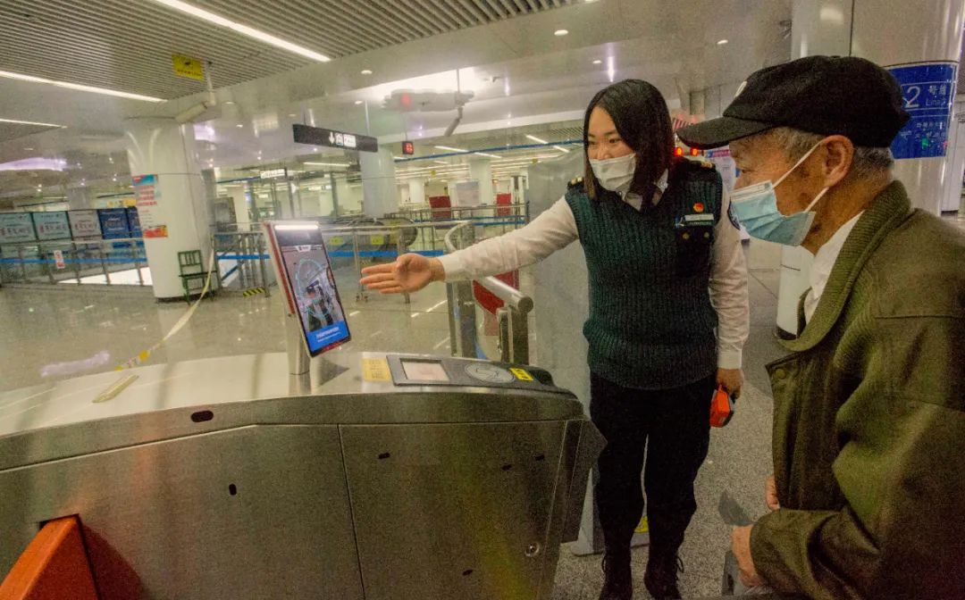 东风广场地铁站入口,地铁工作人员指导老年人使用刷脸设备进站